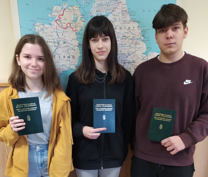 B2 szintű komplex középfokú nyelvvizsgával büszkélkedhet Gajdos Lilla Dorka 8.a osztályos tanuló, valamint a 8.d kéttanítási nyelvű osztályból Fekete Hanna és Simon Dániel.