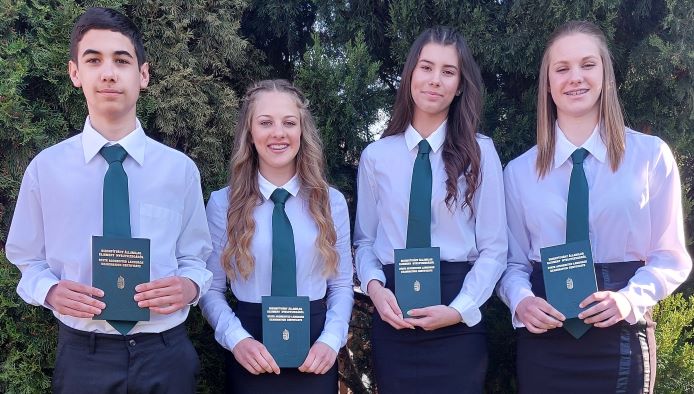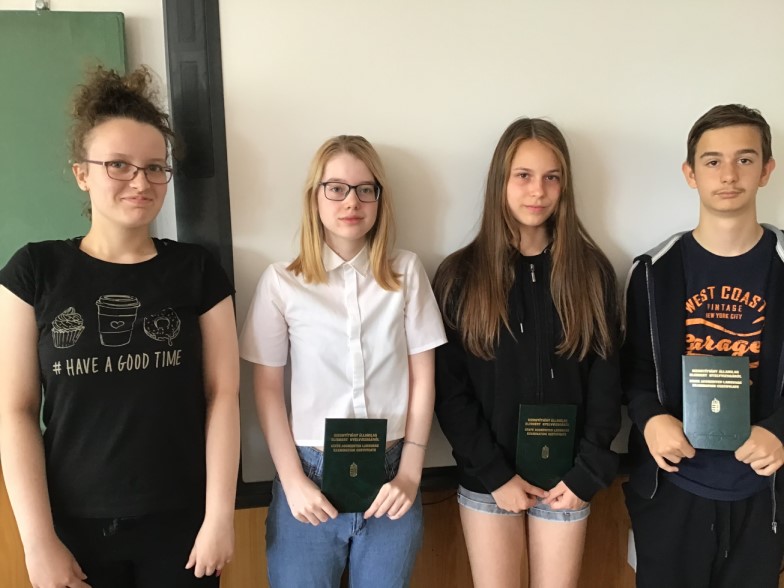 B2 szintű komplex középfokú nyelvvizsgával büszkélkedhetnek Nagy Dorka, Sándor Hanna Barbara, Tóth Regina és Tündik András 8.d osztályos tanulók, akik a nyolc éven át tartó kitartó szorgalmuknak köszönhetően, a napokban vehették át bizonyítványaikat.