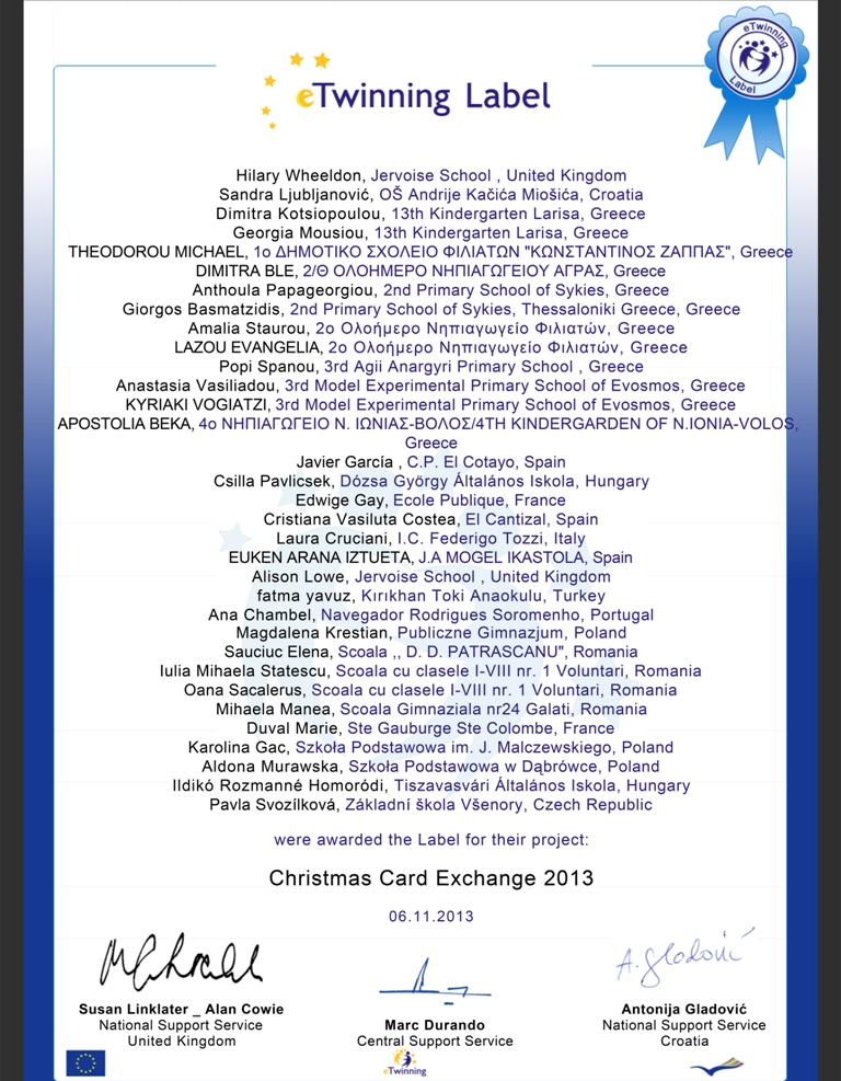 Küldtünk képeslapot az Egyesült Királyság, Horvátország, Görögország, Spanyolország, Franciaország, Olaszország, Portugália, Törökország, Lengyelország, Ciprus, Finnország, Cseh Köztársaság, Németország, Románia iskoláinak.